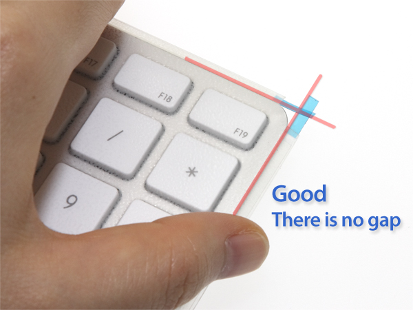製品の「裏面」を下にして、骨格となる粘着のり面(フッ素ライナーコア)でキーボードの4つの角の中で自分で付け易い角で、キーボードの角と、ライナーの端の当たる部分に隙間が空かない様に位置決めをします。